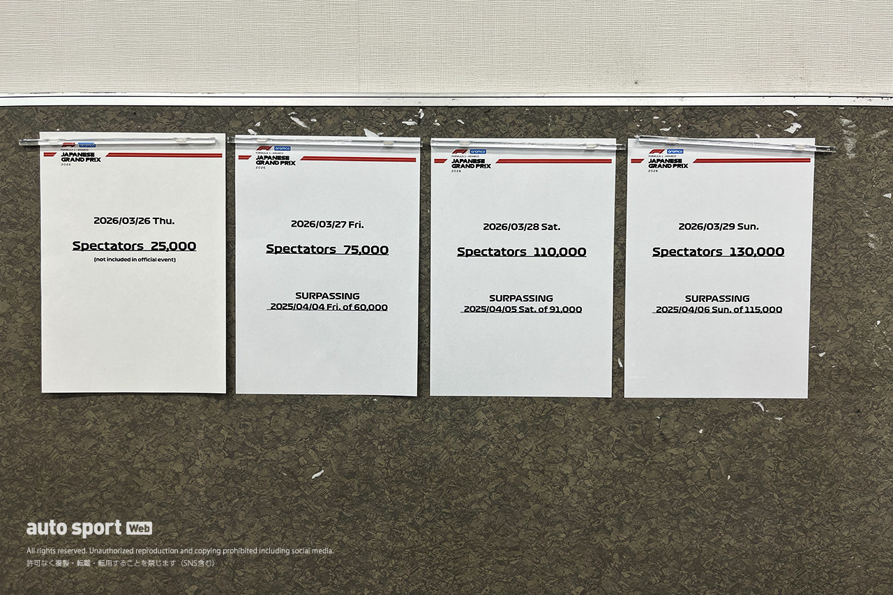 F1の走行が始まった27日(金)の観客動員は7万5000人。2025年大会の金曜日の観客動員数が6万人だったこともあり、金曜日の時点で前年比1.25倍に達していた。予選が行われた28日(土)は11万人が来場。前年の記録を1万9000人上回り、前年比は約1.2倍。そして決勝レースが行われる29日(日)は13万人が来場したことが明らかになった。