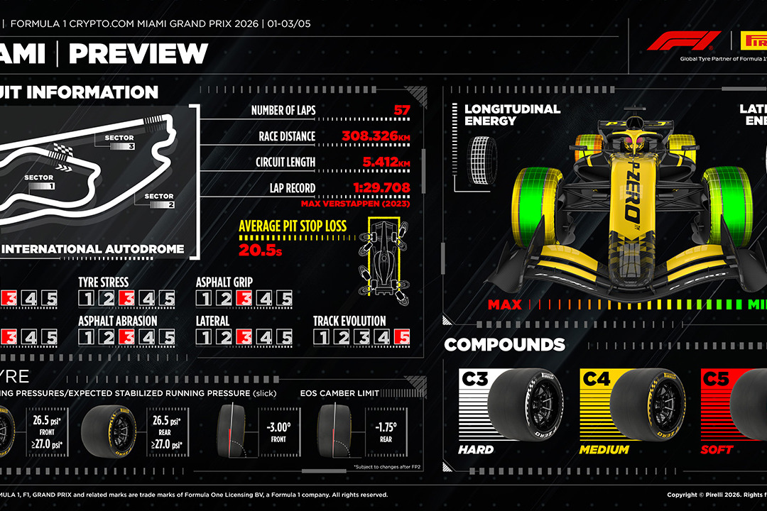 5月1〜3日に開催される今年のマイアミGPは、気温が非常に高くなることが予想されている。ピレリはこの週末、ハードタイヤがC3、ミディアムタイヤがC4、ソフトタイヤがC5という最も柔らかい3種類のタイヤを投入することを決めており、それに加えて日曜日の午後にはマイアミを嵐が襲う可能性があるので、各チームのタイヤ戦略は大きく揺らぐことになるだろう。
