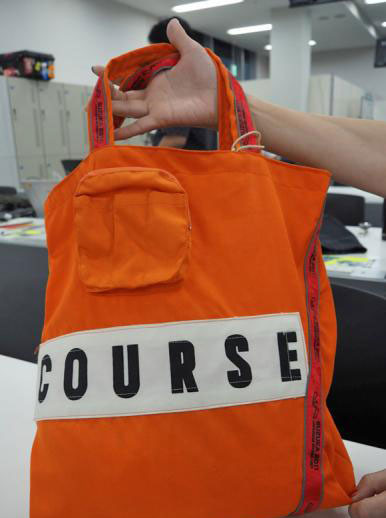 こちらはなんと、自分の着用していたマーシャルのつなぎから作った、世界でたったひとつのレア物。上のポケットは、もともとつなぎの肩に付いていて、ペンなどを差すのに使ってたものだそう。『COURSE』はコース上に出てマシン撤去作業を行なうマーシャルの印で、アクセントのリボンは、2011年日本グランプリ用のパスを提げていたストラップですね。