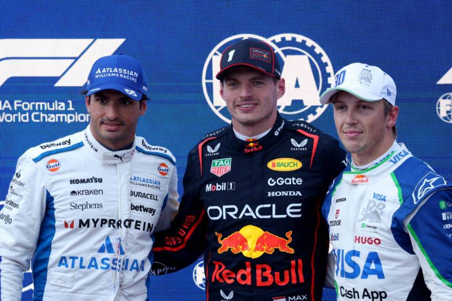 2025年F1第17戦アゼルバイジャンGP予選 左から2番手カルロス・サインツ(ウイリアムズ)、PPマックス・フェルスタッペン(レッドブル)、3番手リアム・ローソン(レーシングブルズ)